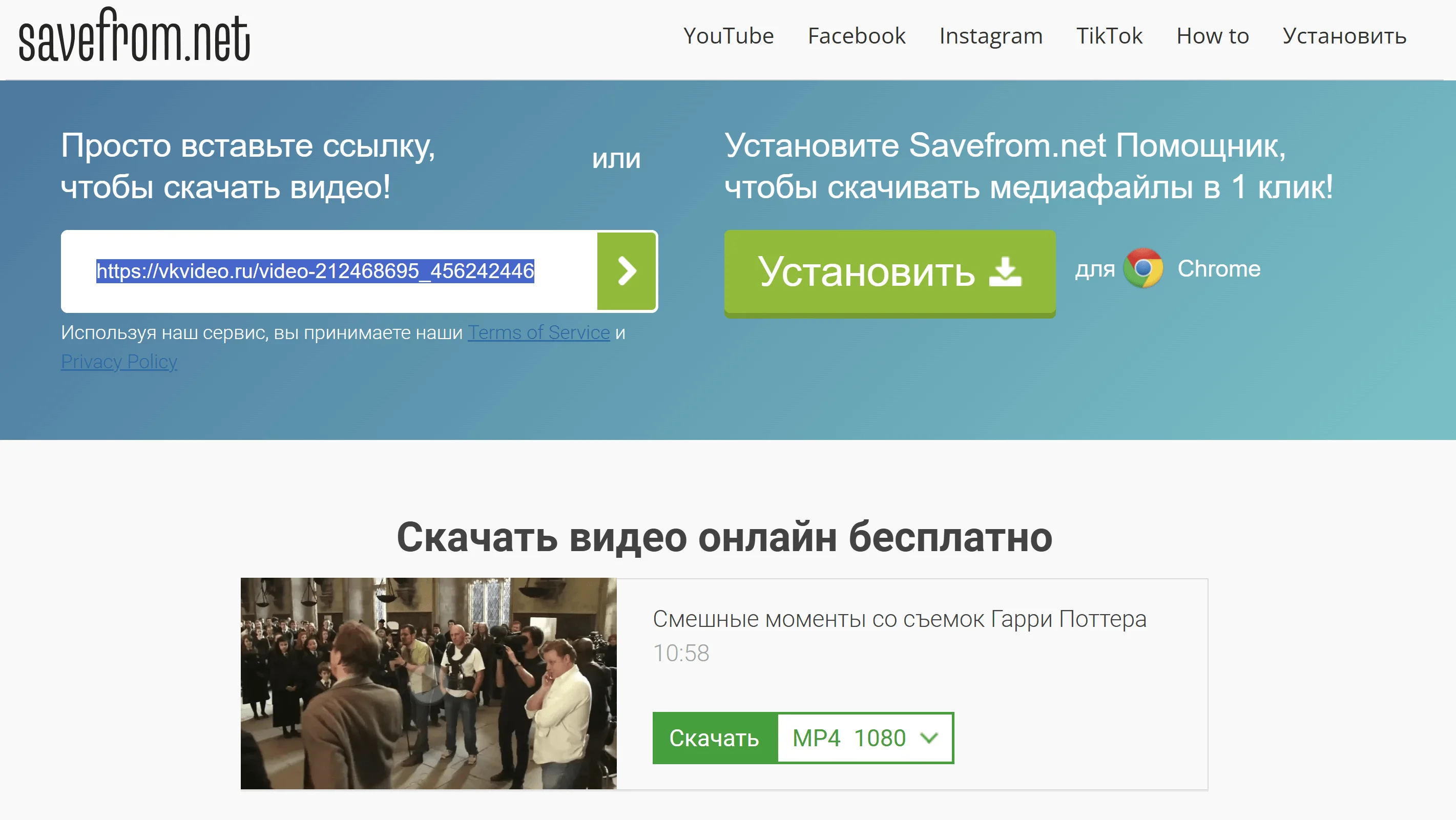 Например, сервис SaveFrom.net предлагает вставить ссылку в поле и скачать видео. Под полем отобразится превью видео, которое вы собираетесь скачать.