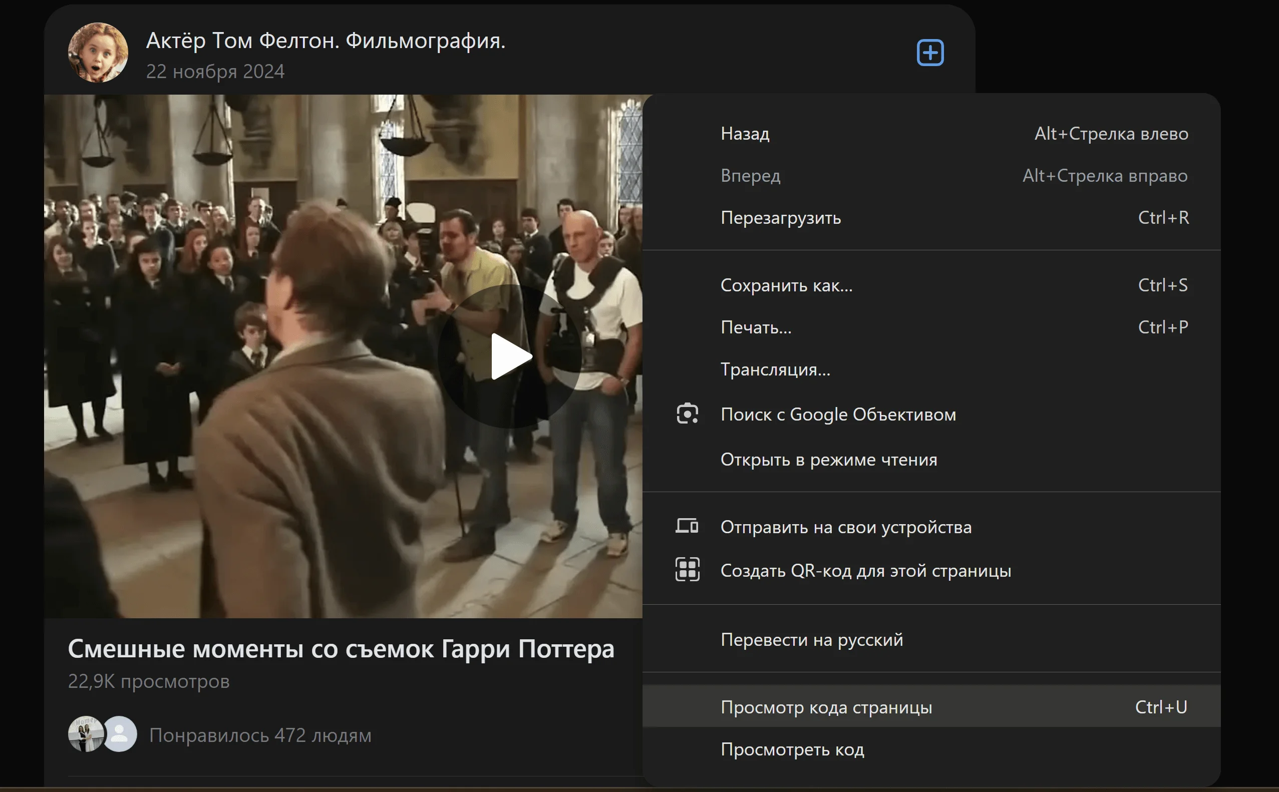 Кликните правой кнопкой мыши на пустое поле за пределами видео. В выпадающем меню выберите «Просмотр кода страницы» или «Исходный код страницы».