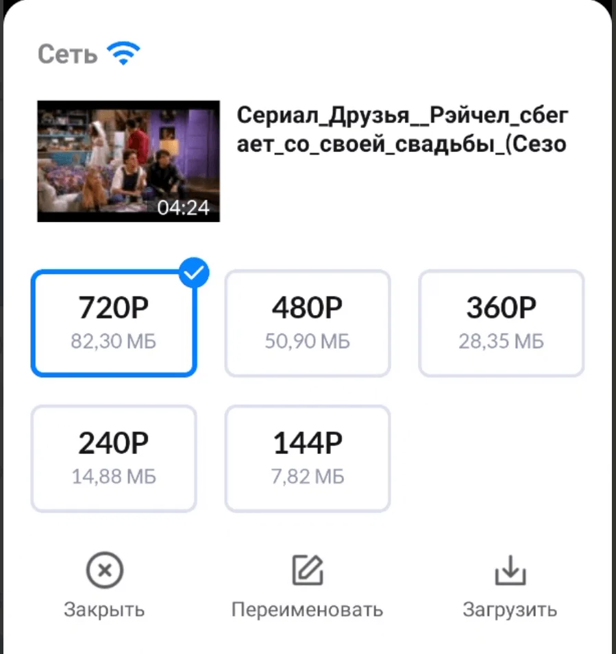 Выберите качество видео и нажмите на стрелку — ролик сохранится в папке «Загрузки».