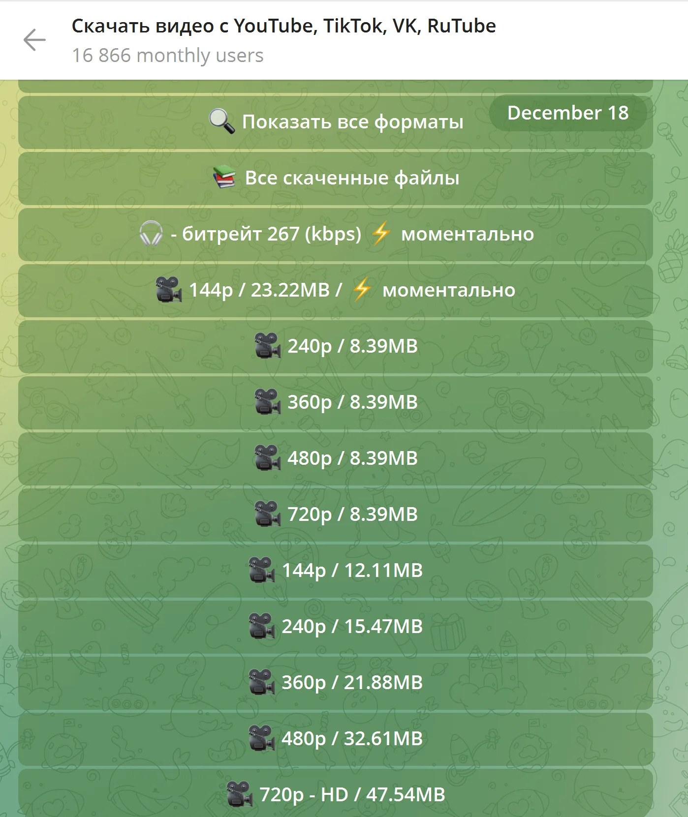 В Telegram есть боты, способные скачать видео из соцсетей: EjjeBot, MVKVideoBot, SkachatVKBot, и другие. Мы попробуем скачать видео с помощью DNVideoBot. Для этого нужна только ссылка на видео. Дальше бот предложит выбрать качество загрузки видео.