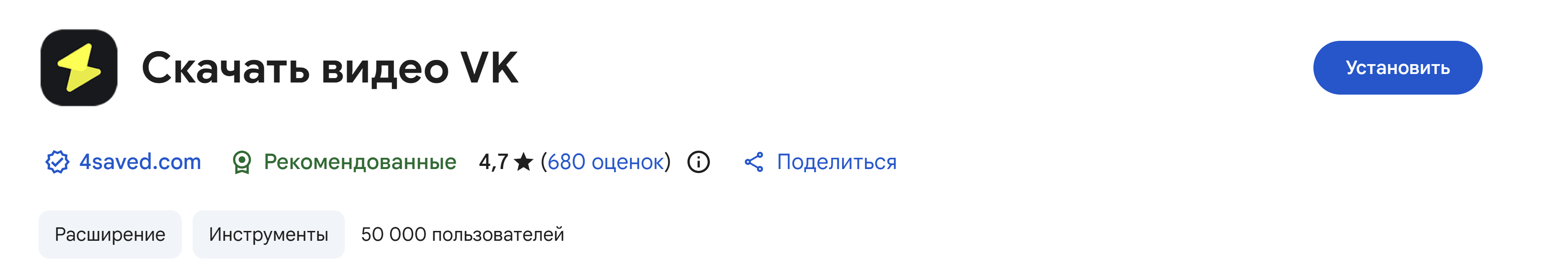 В магазинах браузеров есть разные расширения — наберите в строке поиска «скачать видео из VK Видео» и выберите лучший плагин по отзывам и рейтингу. Например, в магазине расширений для браузера Google Chrome есть расширения «Скачать ВК Видео», «VK video saver», «VK video downloader», и другие. Мы покажем на примере «Скачать видео VK» — у него 680 отзывов и рейтинг 4,7 из 5. Чтобы пользоваться расширением, его нужно установить по кнопке справа.