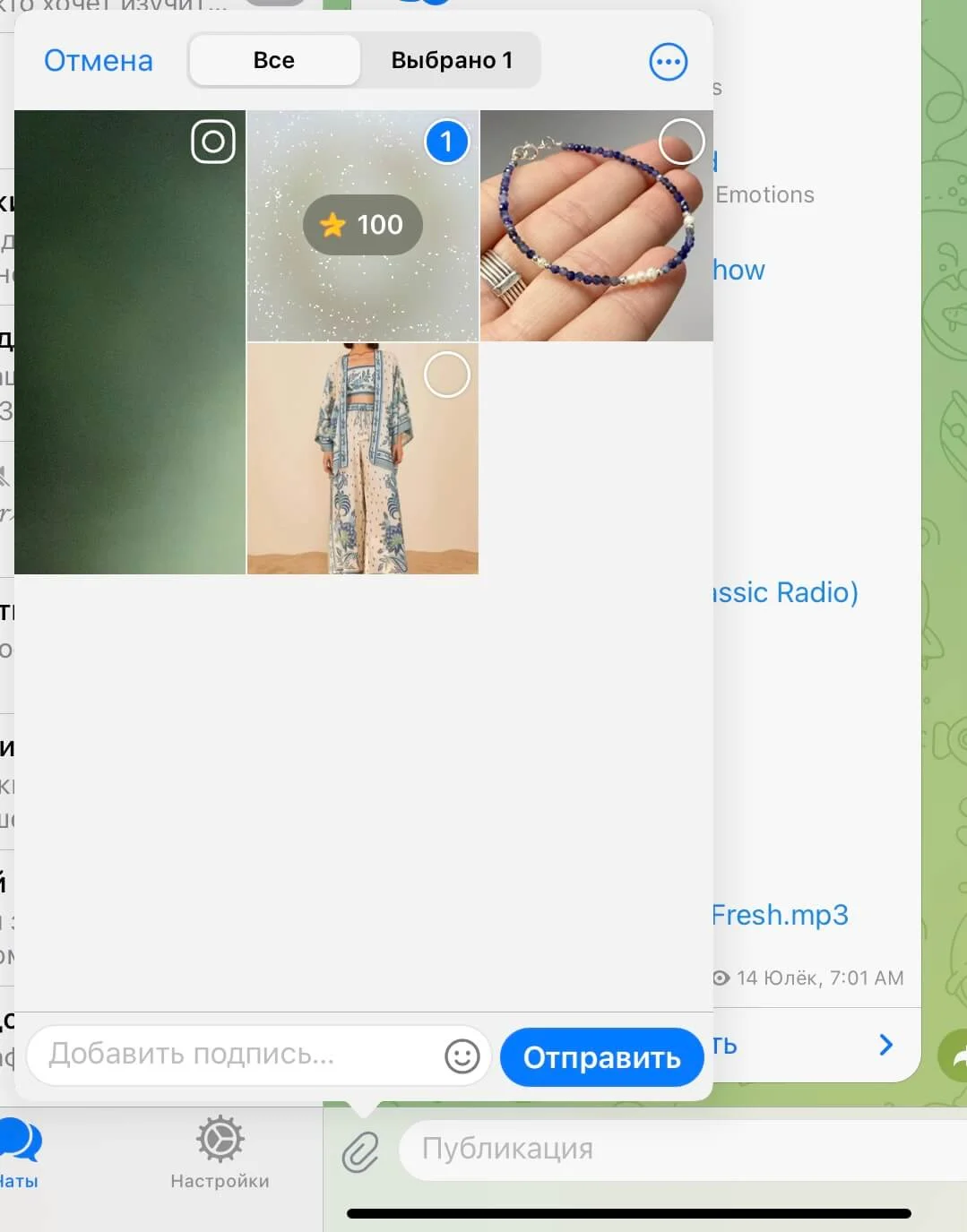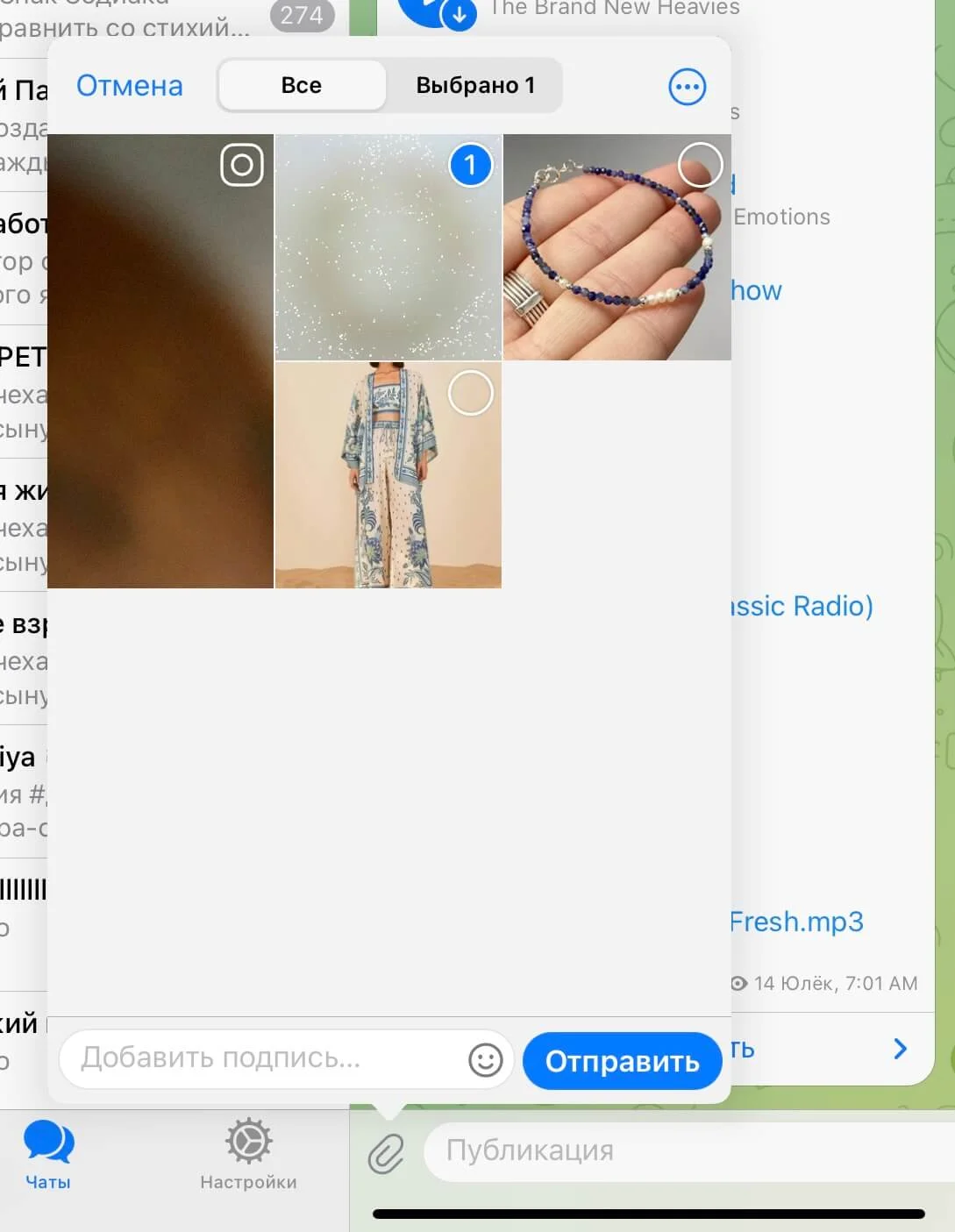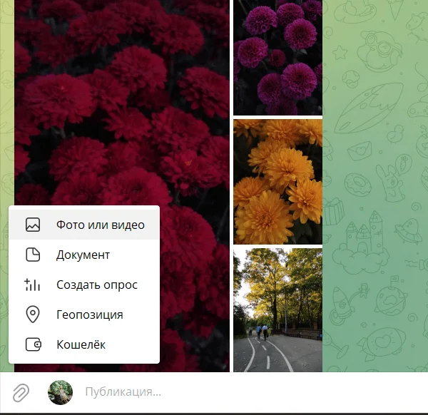 1. Откройте канал, чат или группу, куда хотите отправить картинку или видео.