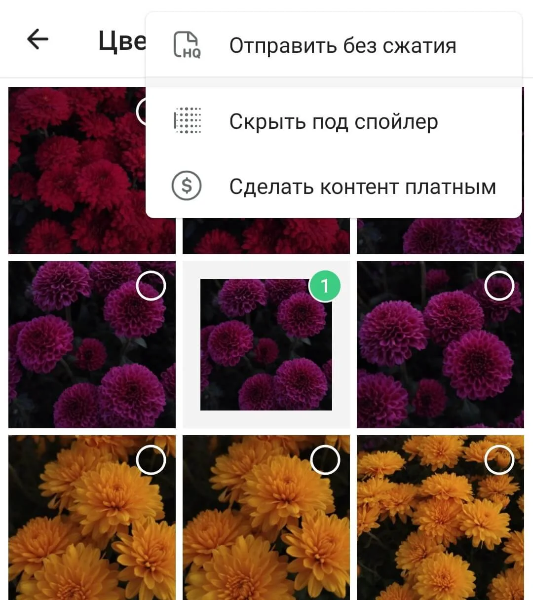 1. После выбора нужного файле в галерее нажмите на три точки в правом верхнем углу и выберите функцию «Сделать контент платным» — в сравнении с iOS отличается только формулировка функции.
