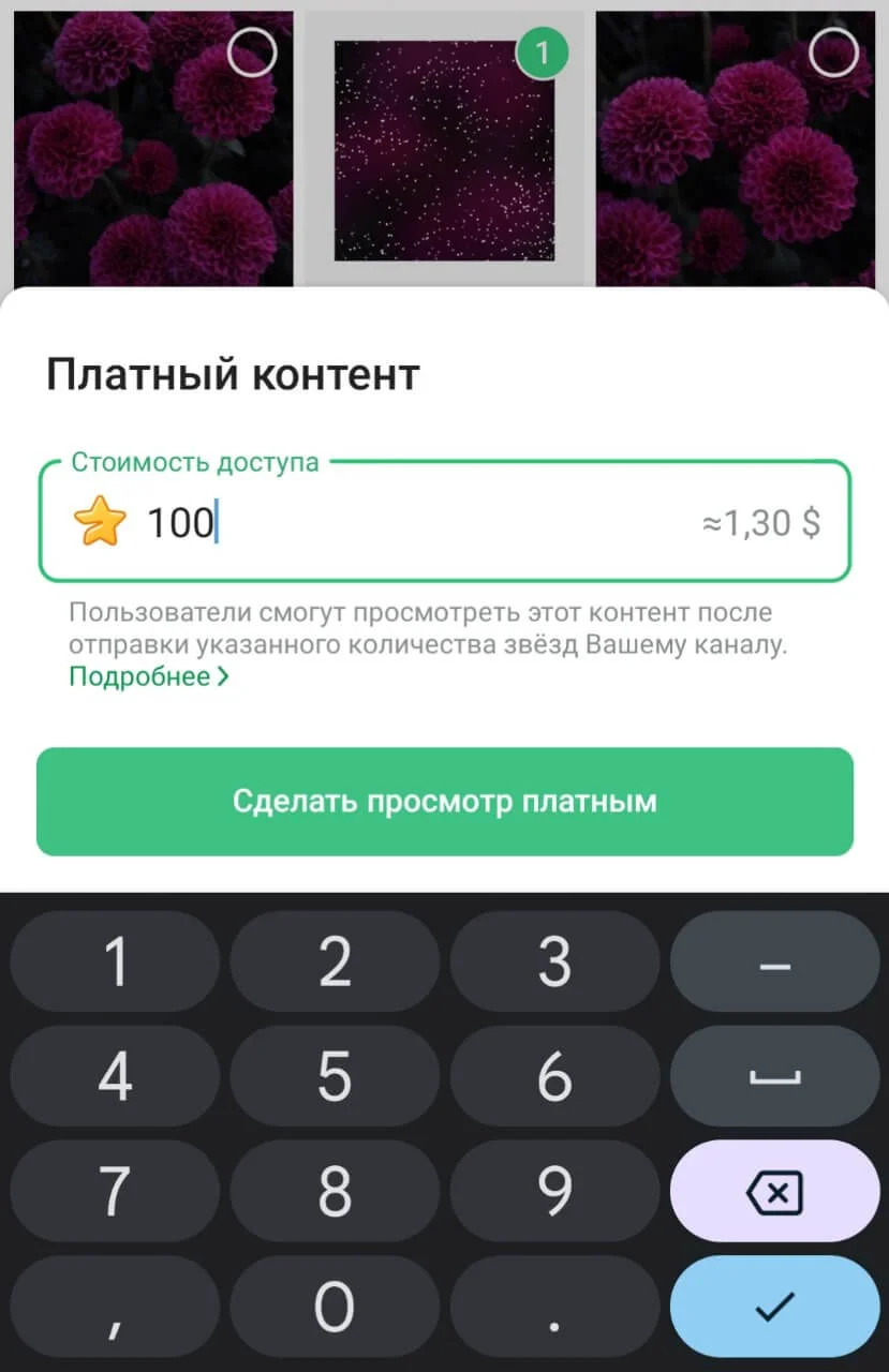 2. Снизу появится окно с предложением выбрать цену за просмотр контента — введите комфортную для вас сумму.