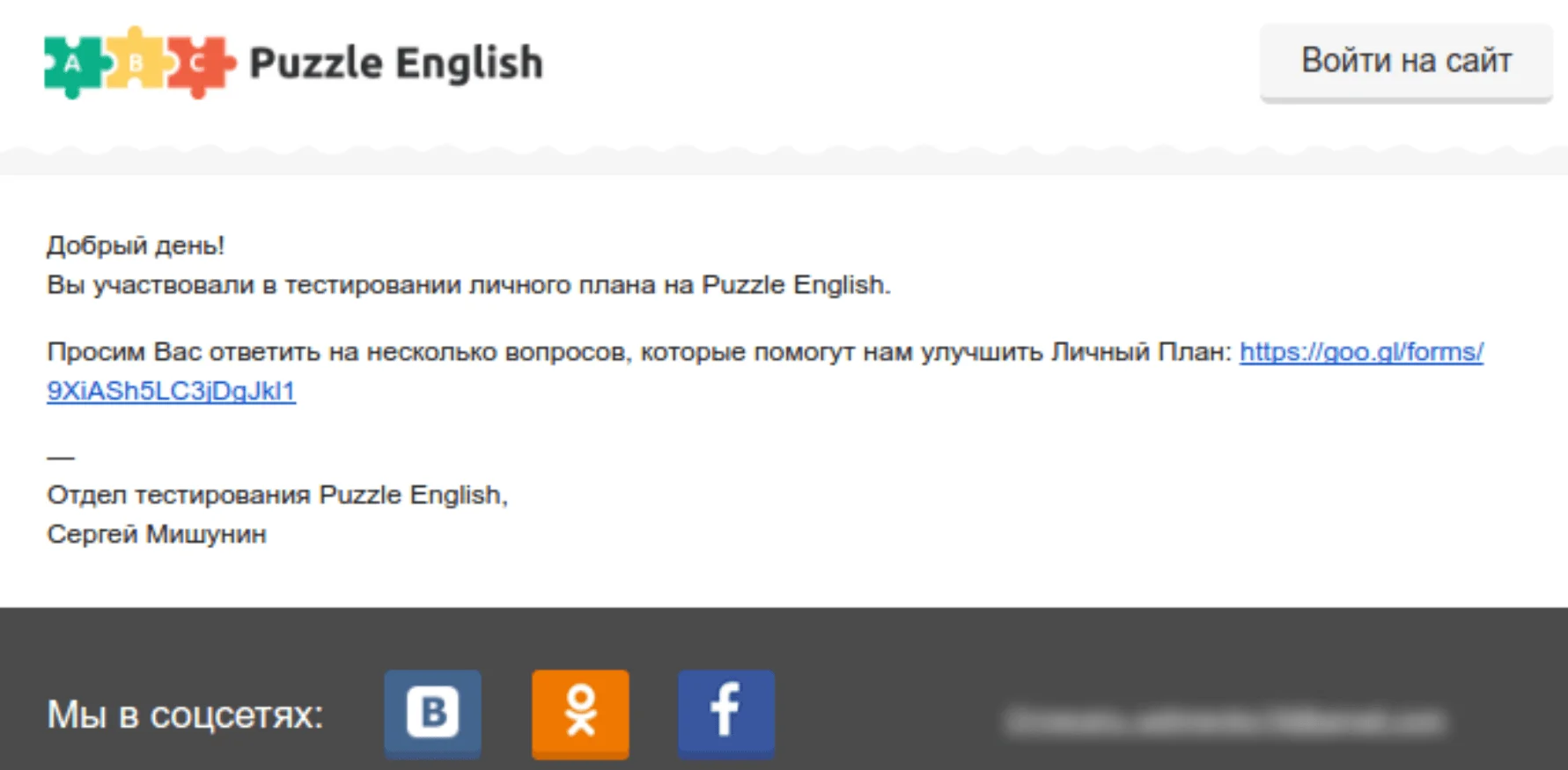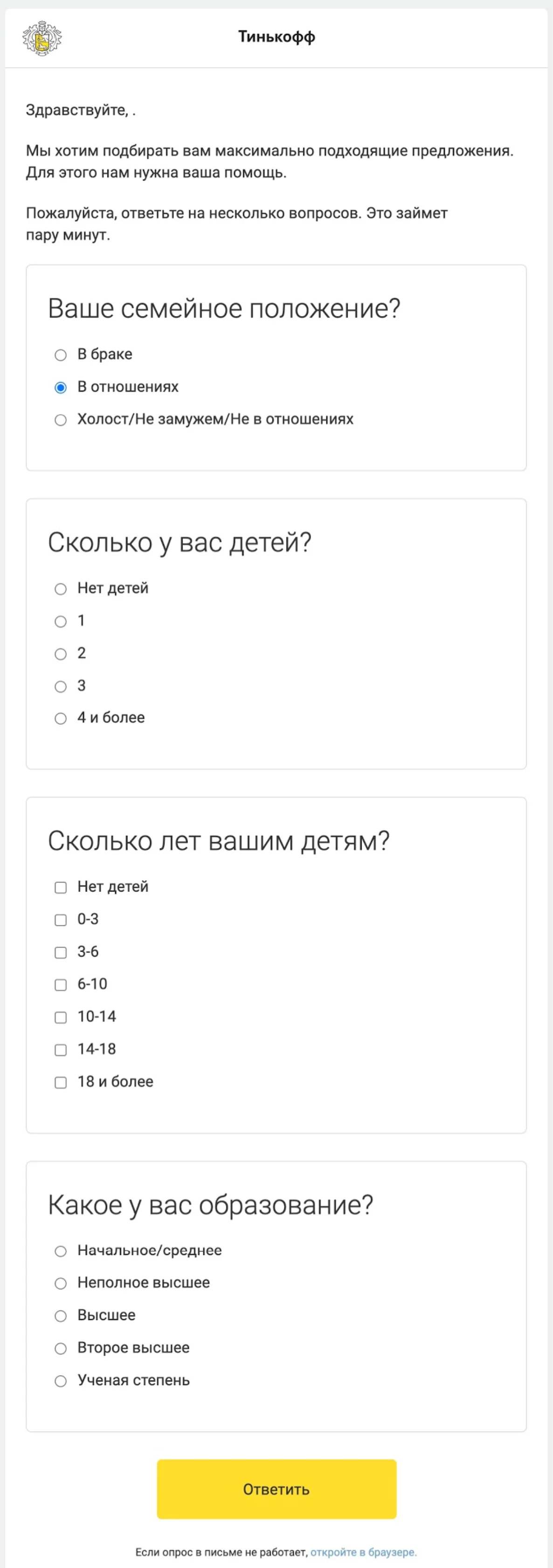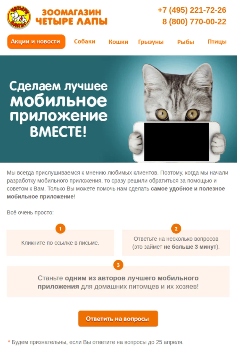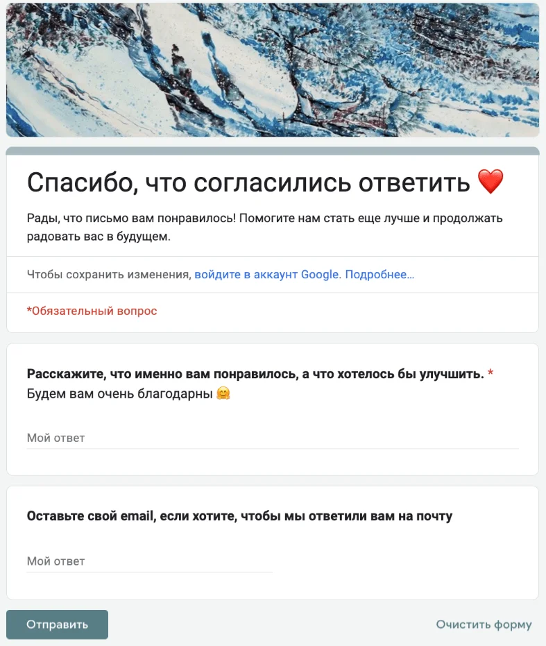 Иногда вопросов много или вам нужно получить более детализированные ответы — письмо получится слишком длинным. В этом случае лучше создать анкету на отдельной странице, чтобы подписчики могли сразу ответить. Вставьте в письмо ссылку на опрос.
