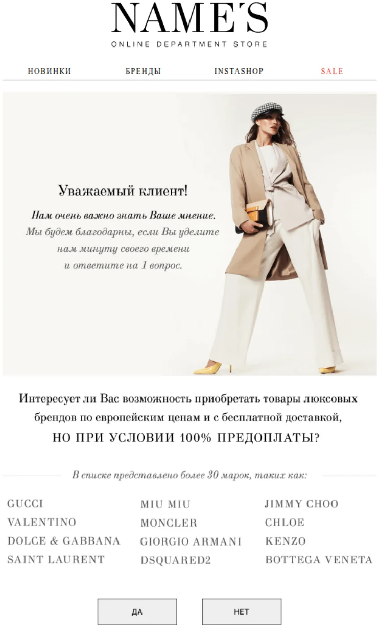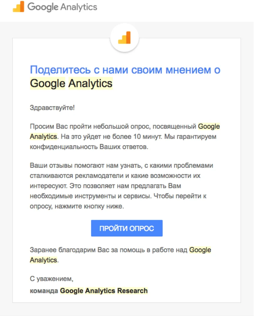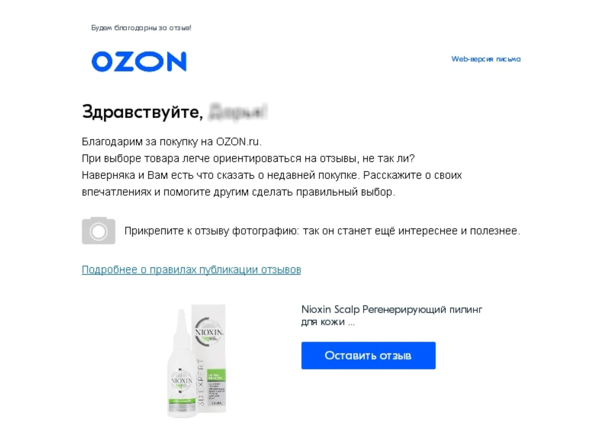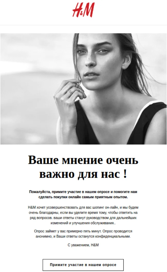 Этот вариант подойдёт, когда вам нужно получить мнение конкретных клиентов — например, тех, кто приобрёл конкретный товар, или оформлял доставку вместо самовывоза. Отправьте персонализированные письма, основываясь на предыдущем взаимодействии с вами. В такой рассылке лучше упомянуть, почему вам важно мнение именно этого человека — так вероятность получить развернутый фидбэк выше.