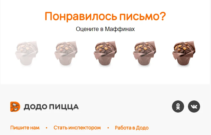 Также можно использовать для рейтинга символику, связанную с вашим брендом. Например, «Додо пицца» просит оценить письмо от 1 до 5 в маффинах.