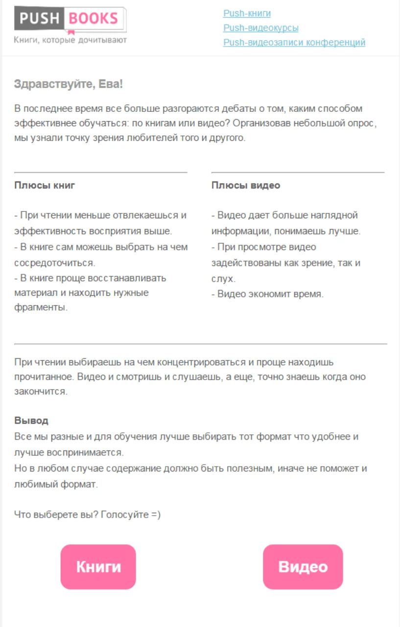 Если вам нужно провести сравнение нескольких продуктов или услуг, то целесообразно так и написать на кнопках названия объектов голосования. В письме обязательно расскажите, зачем вам это.