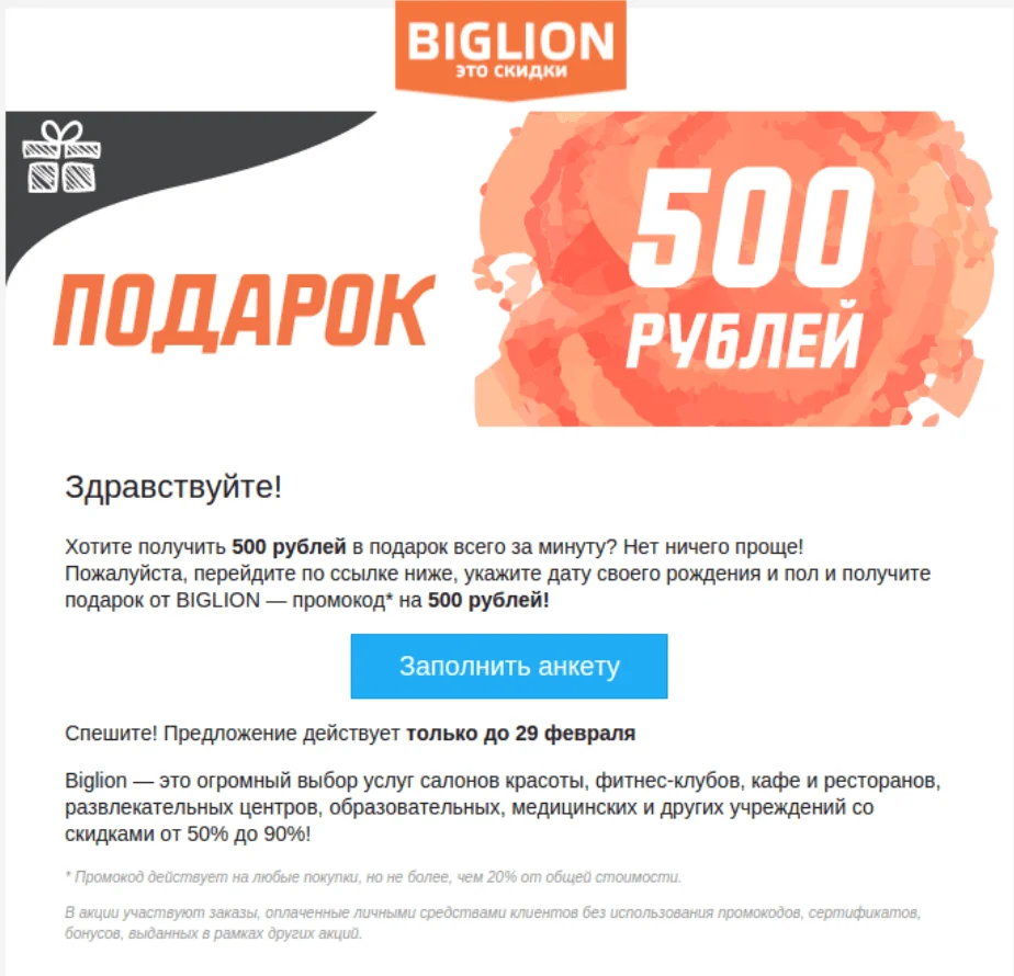 В качестве благодарности можно сделать подарок: промокод, скидку, бонус, полезные материалы — даже если вы не объявляли о «награде» заранее. Небольшой знак внимания будет приятен пользователям, и в следующий раз они охотнее откликнутся на ваши запросы.