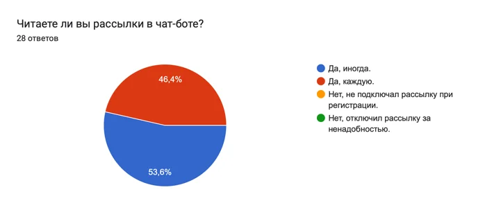 Эта часть работы с чат-ботом — больная тема. Фиксировать и считать результаты оказалось невозможно без данных. Однако это беспокоило только меня: приходилось изворачиваться и высчитывать хоть что-то вручную. Иногда получалось, иногда нет.