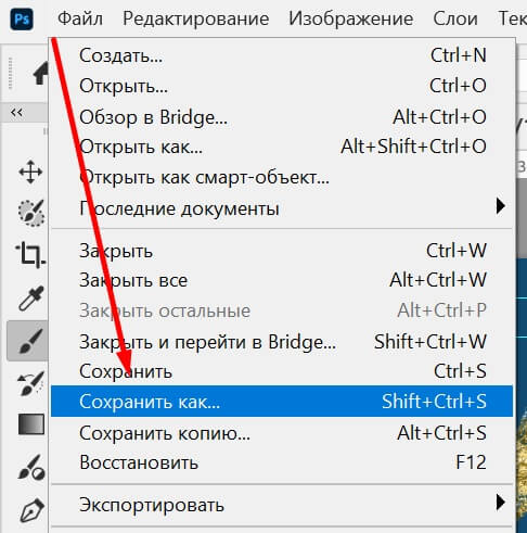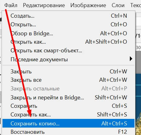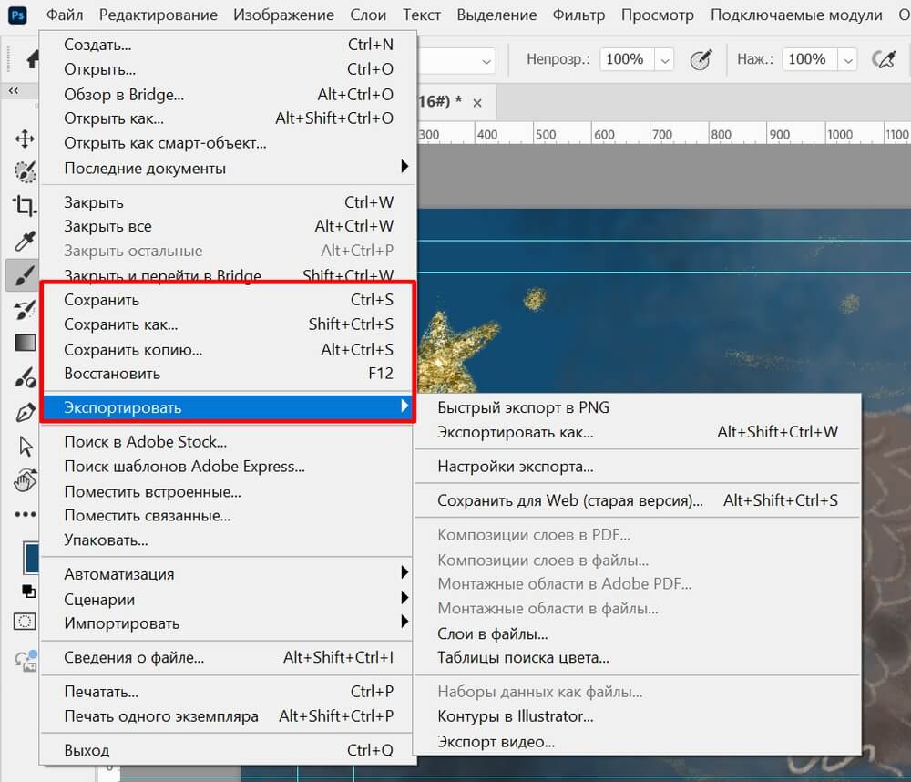 В Photoshop есть похожие действия — «Сохранить», «Сохранить как…», «Сохранить копию…» и «Экспортировать». Все действия расположены внутри меню файла. И каждое решает свою задачу.