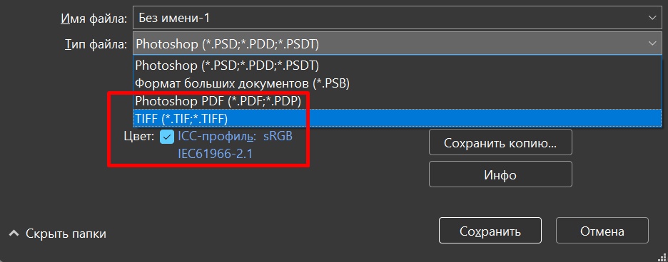 Когда вы выбираете формат через это меню «тип файла», программа запоминает настройку. А затем при быстром сохранении создает файл именно в PSD, PSB, PDF или TIFF. Чтобы изменить это, нужно снова выбрать тип через меню «Файл» → «Сохранить как…».