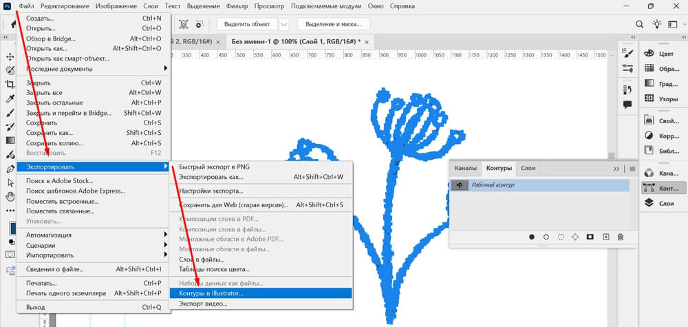 Чтобы выгрузить работу корректно, слои должны быть фигурами или текстом. Любые растровые картинки, смарт-объекты и эффекты лучше упростить — переводить в контуры с помощью быстрого выделения. Затем нужно выбрать «Файл» → «Экспортировать» → «Контуры в Illustrator».