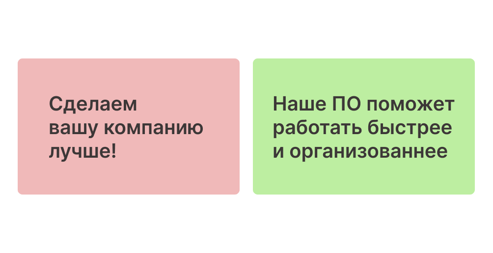 Конкретность. Должны быть указаны конкретные преимущества, которые получит клиент. Важно отобразить осязаемую ценность, а не нечто абстрактное. К примеру, «наш продукт лучший» — это абстрактно. А «наш продукт проходит тройной контроль качества, прежде чем попасть к вам» — уже звучит более конкретно.