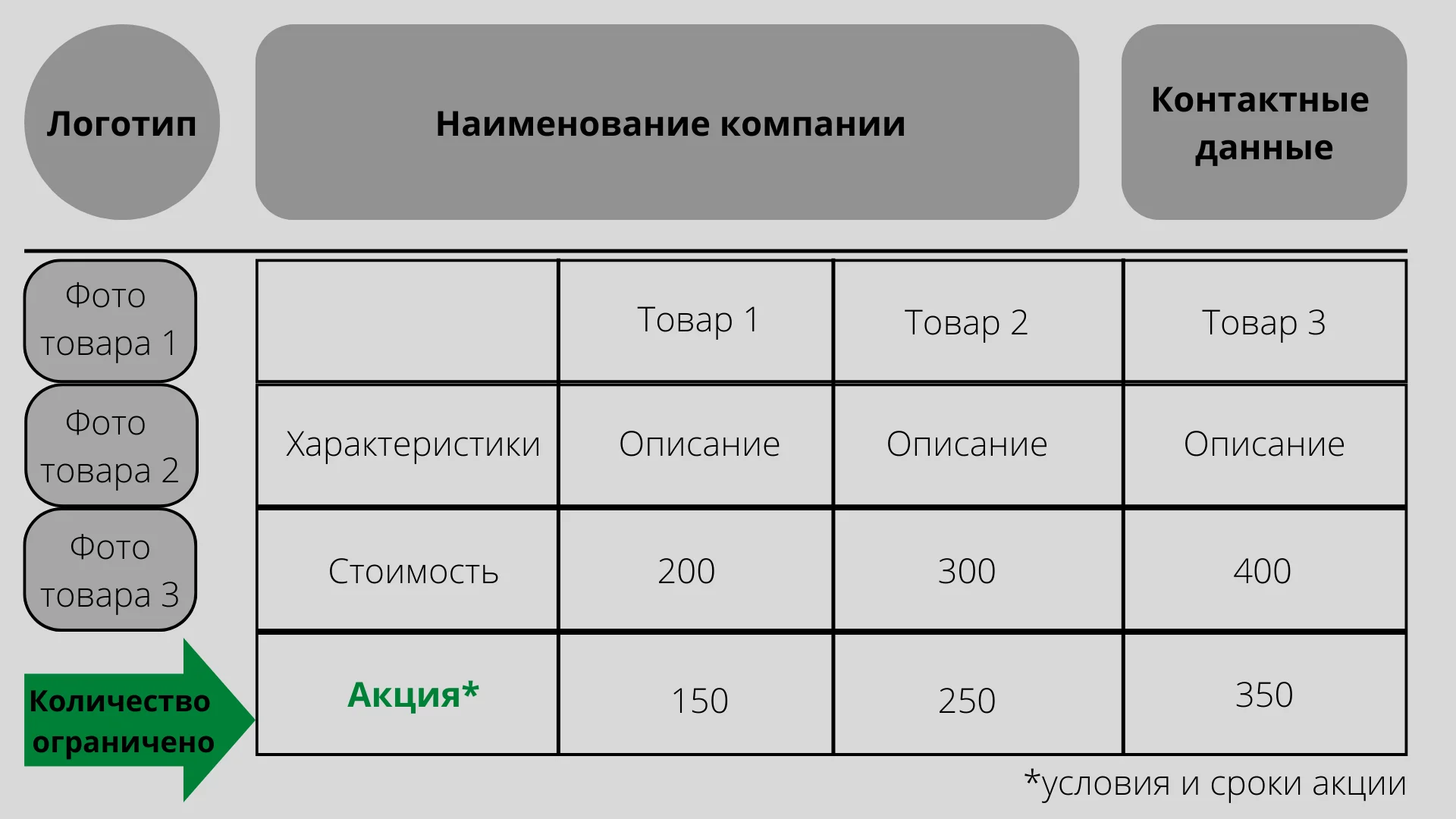 Обязательное условие акционного прайса — разъяснение условий акции или спецпредложения. Если кратко не получается, то можно сделать сноску в документе и добавить всю важную информацию.
