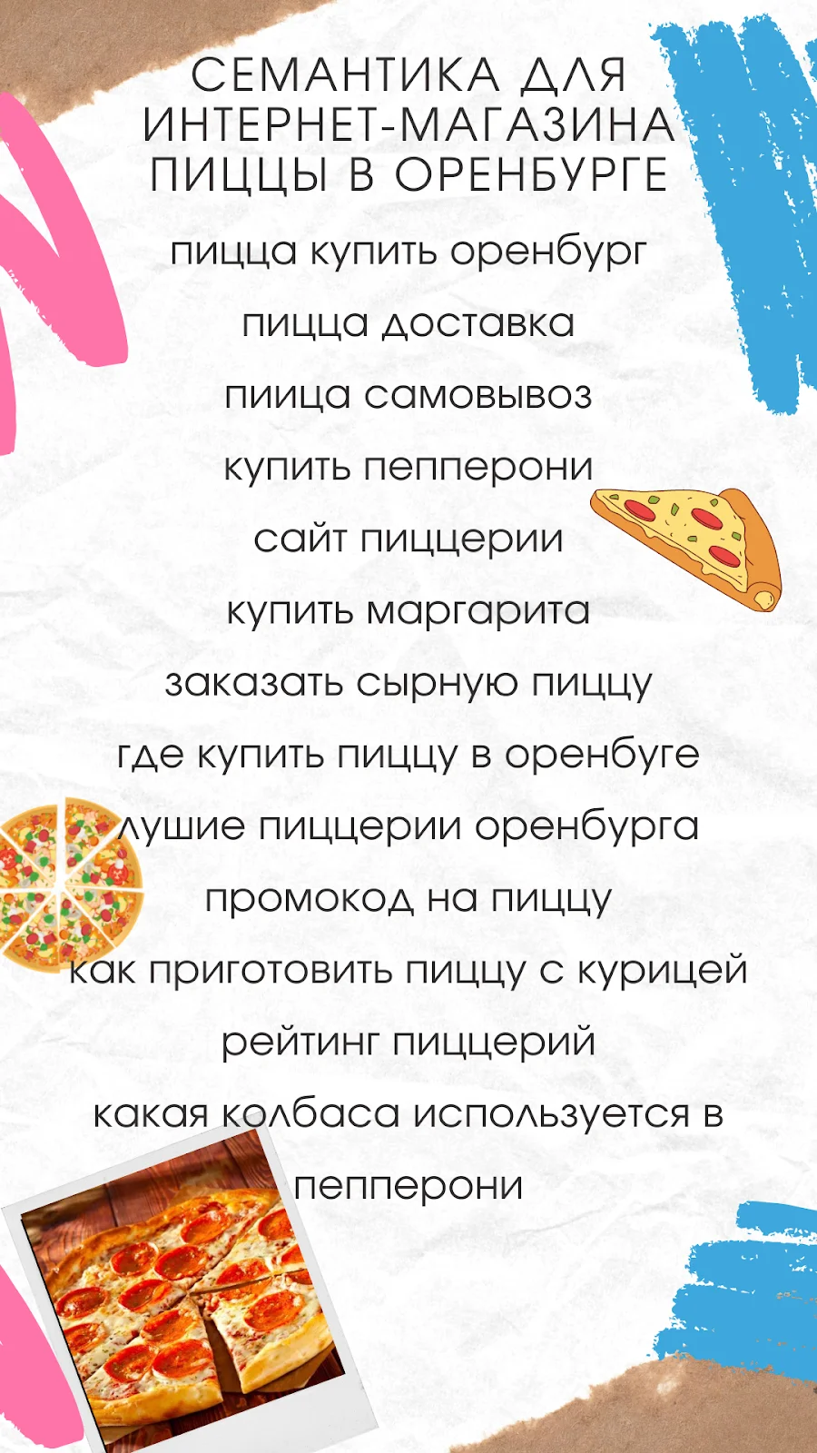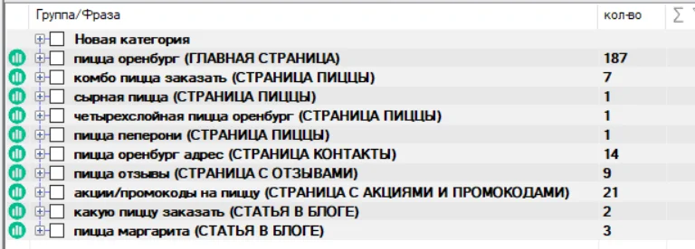 Теперь покажу на примере, что у вас должно получиться на этом этапе. В моем примере я собираю семантику для интернет-магазина пиццы в Оренбурге. Я сгенерировал такие запросы: