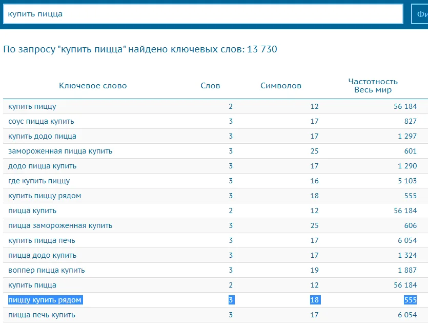Если вы видите, что низкочастотные запросы повторяют основные запросы, только в них содержится странный хвост — их тоже можно удалять. В нашем примере про пиццу выяснилось, что все запросы с частотой 10 и меньше можно убрать — они так или иначе копируют запросы, которые уже есть.