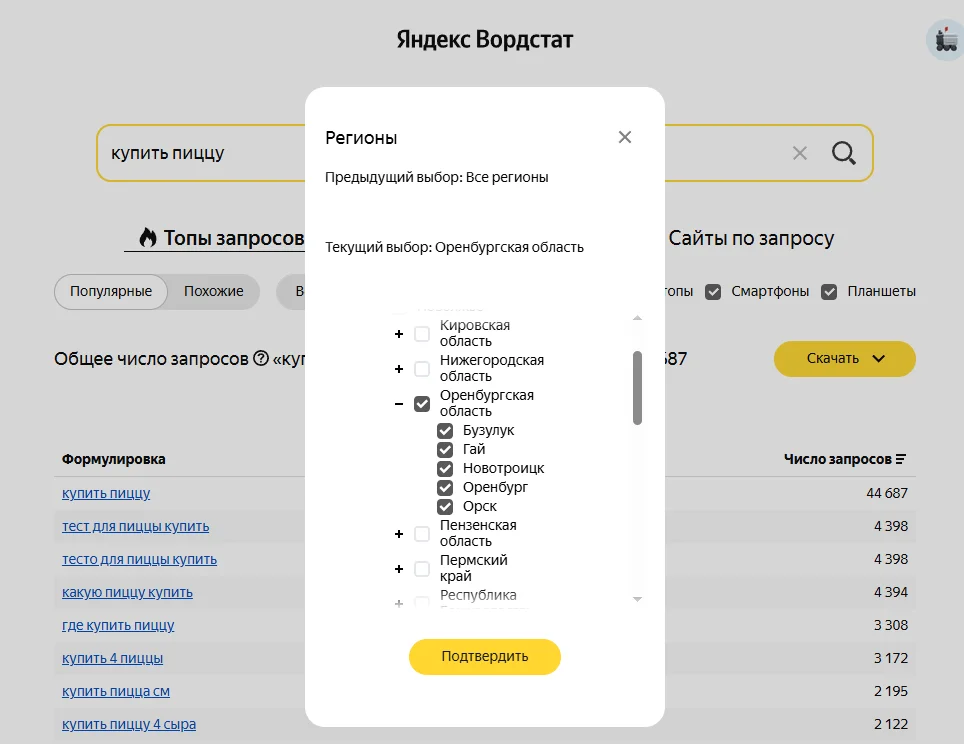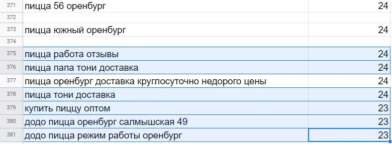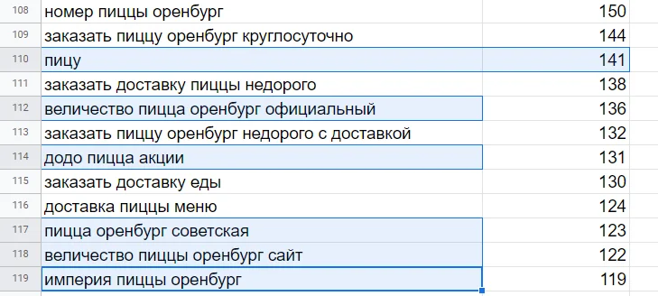 Несмотря на то, что я смотрел запросы только по Оренбургу, в результаты Яндекс Вордстата подмешались левые запросы — пицца Сорочинск и Самара. Удаляем.