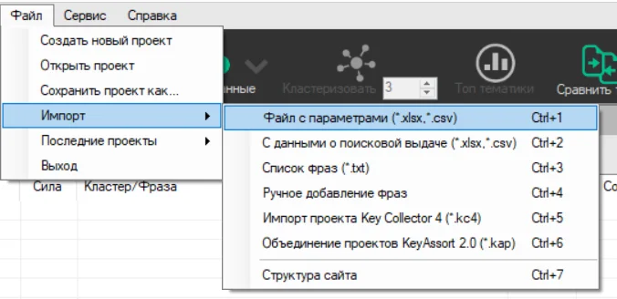 Кластеризация. Нажимаем в верхнем меню «Кластеризация» и начинаем эксперименты с настройками. Цель — получить адекватную сборку кластеров. Мы можем менять вид кластеризации, силу группировки и другие параметры — подробнее об этом читайте в справке KeyAssort.