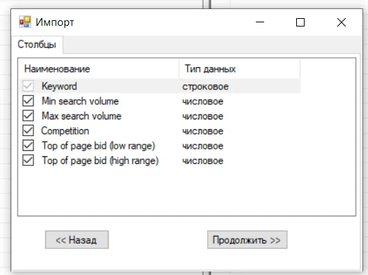 В первый столбец копируем запросы, а частотность копируем во второй и третий столбец (Mix search volume и Max search volume) — то есть их нужно продублировать. Поставьте значение «0» во всех остальных ячейках и «low» в Сompetition. Теперь импортируем: