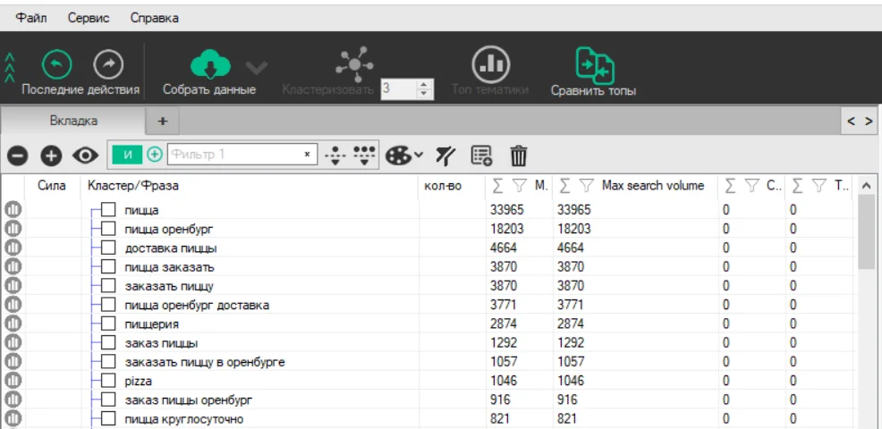 Сбор данных. Теперь нужно, чтобы программа проанализировала запросы и выявила среди них кластеры. Нажимаем «Собрать данные» в верхнем меню: