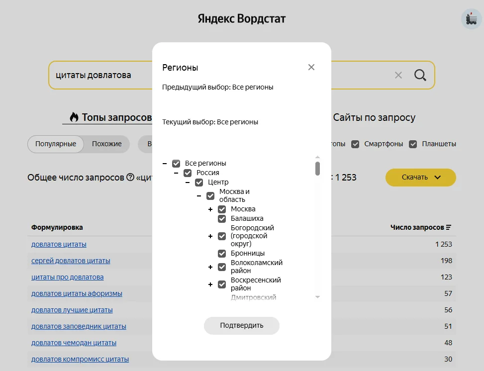 Если у вас локальный бизнес, семантику нужно составлять с учетом геозависимости. Для этого в Яндекс Вордстате есть настройка по региону — информация будет выводиться только по нему. А если у вас онлайн бизнес, то на геозависимость можно не обращать внимания — в Вордстате по умолчанию выбраны все регионы.