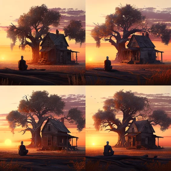 Сделаем запрос для примера: «В поле стоит старый деревянный дом. Рядом стоит одно большое дерево, одна скамейка. На скамейке сидит пожилой мужчина. Закат».