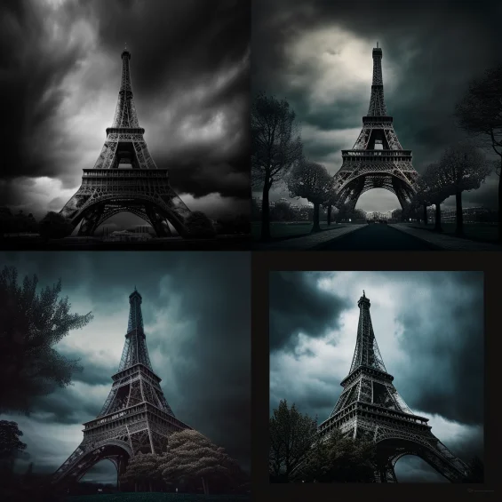 А такое получается по запросу «Эйфелева башня в хмурый и пасмурный день, тусклое освещение».