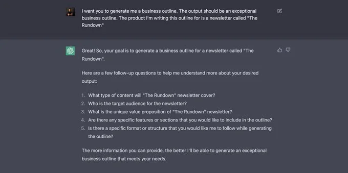 Шаг второй. Отвечаем на вопросы от нейросети. В примере из Twitter разработчик попросил, чтобы ChatGPT сгенерировал для него бизнес-план. Продукт, для которого нужен бизнес-план, — бюллетень под названием «X».