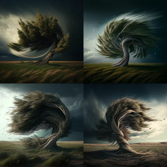 А вот по запросу «Ураган, ветер дует в поле и гнёт дерево» сила природы так и чувствуется.
