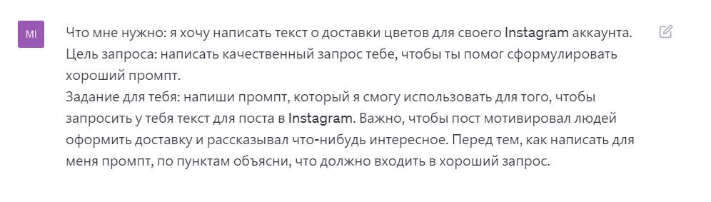 По-другому этот способ можно назвать двойной подсказкой. Как он работает: сначала вы пишете боту запрос. Например: «Я хочу написать текст о доставке цветов, который опубликую в своем Instagram* аккаунте. Затем нужно объяснить боту, что вы пытаетесь сделать — «Написать качественный запрос тебе, чтобы ты помог сформулировать хороший промпт».