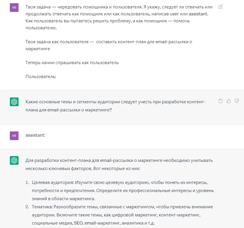 Суть промпта простая: в запросе нужно указать боту, чтобы тот чередовал общение от лица помощника и обычного пользователя: «Твоя задача — чередовать помощника и пользователя».