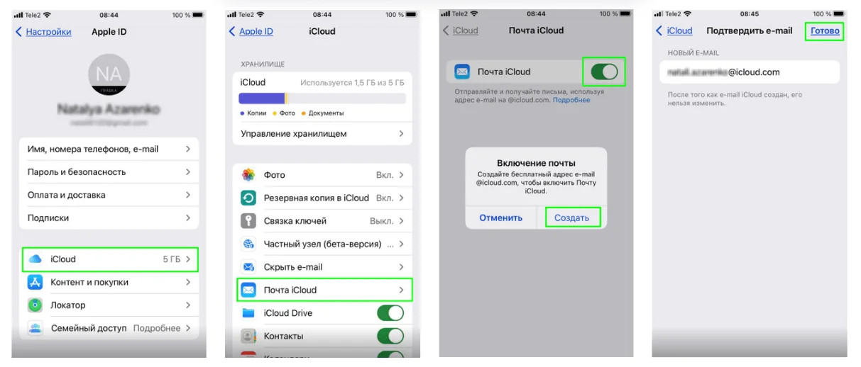 После того, как будет создан Apple ID, почта iCloud включится автоматически. Проверить это можно в настройках. Для этого перейдите в «Настройки» → «Ваше имя» → iCloud. Проверьте, что пункт «Почта» включён.