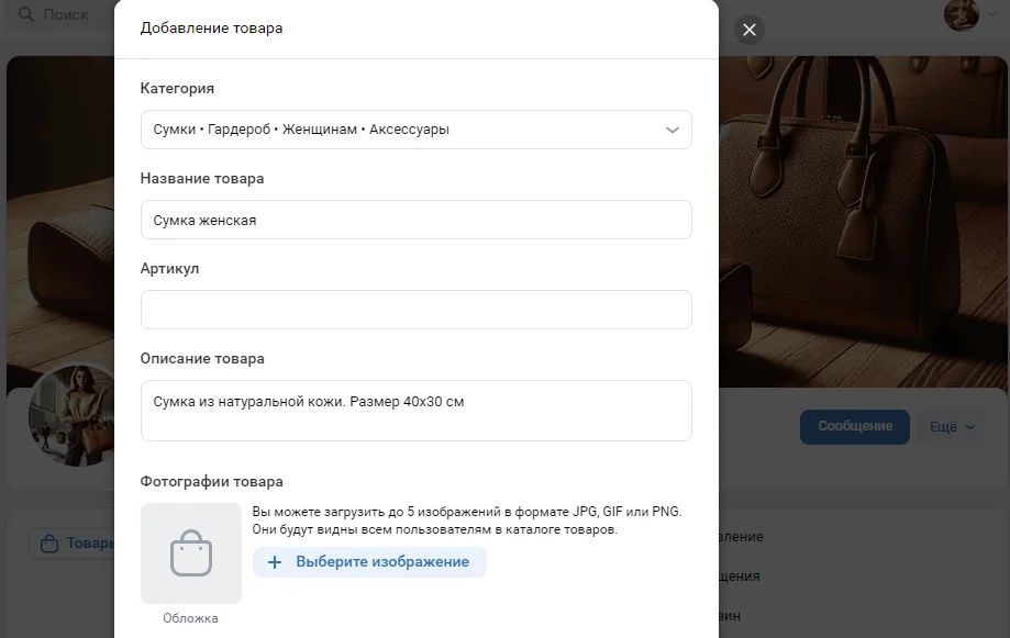 4. На главной странице сообщества есть кнопка для добавления товаров. При нажатии открывается окно, где можно указать категорию, название, артикул, описание, цену, а также прикрепить фото и видео.