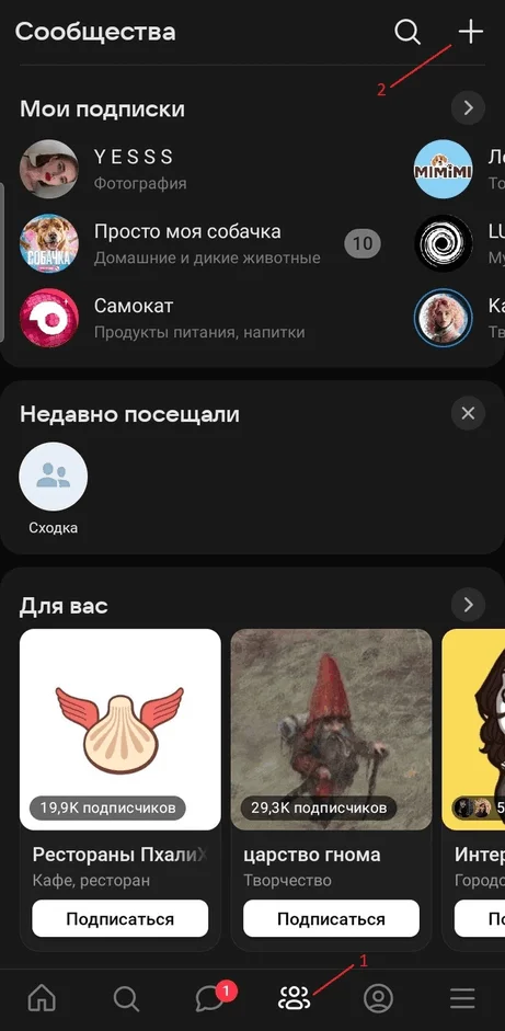 Как создать группу с телефона. Заходим в «Сообщества» — это четвертая иконка в нижнем меню. Нажимаем на значок «+» в правом верхнем углу, чтобы создать сообщество. Дальше порядок действий с ПК и со смартфона одинаковый.