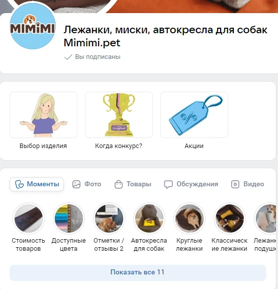 Еще один способ рассказать о продукте — сделать моменты. Это сторис, которые сохраняют в подборках на странице сообщества. Бренд Mimimi.pet в моментах показывает товары, стоимость, отзывы.