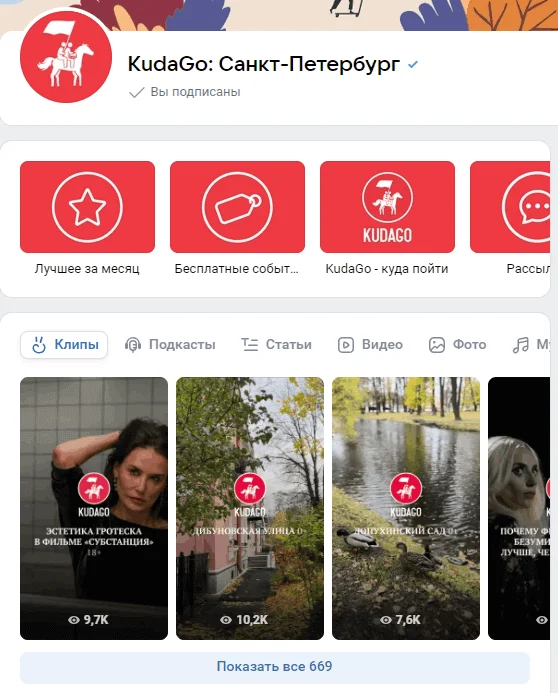 Если сообщество не продвигает товары и услуги, в блоки можно выносить актуальную и полезную информацию. В «KudaGo: Санкт-Петербург» есть меню со множеством плиток, которые ведут в разные места: на посты, в мини-приложения ВКонтакте, в VK Видео. А в блоке ниже на первом месте находятся клипы — трендовый формат.