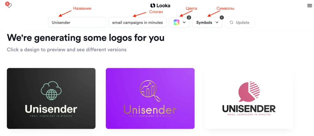 После регистрации нужно ввести название, слоган, выбрать цвета и символы (Symbols) — тематические изображения, которые могут быть использованы в логотипе. На основе этих данных нейросеть предложит десятки вариантов.