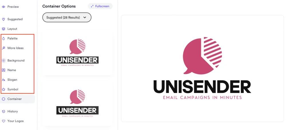 В редакторе доступны дополнительные настройки: просмотр похожих вариантов (More Ideas), изменение палитры (Palette), фона (Background), а также редактирование текста и графики. Генерация идей полностью автоматизирована — выбирать придется из готовых решений.