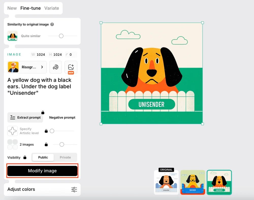 Также можно изменить стиль и переписать промпт — после этого нажать Modify image, и появятся ещё два варианта. Оригинал сохранится, к нему всегда можно вернуться.