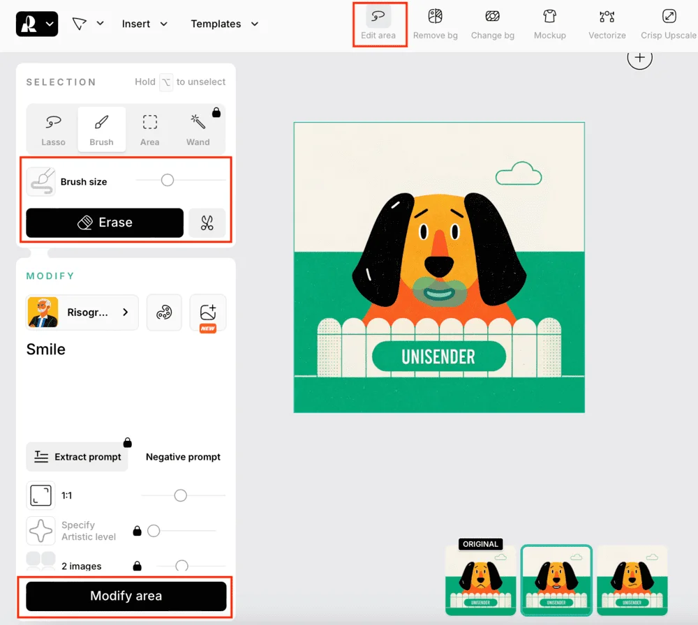 Для локального редактирования включите режим Edit Area в верхнем меню. Выделите нужную часть изображения и введите новый промпт. Выделите область, которую нужно изменить, и напишите подходящий промпт. Либо просто удалите или вырежьте ее с логотипа, нажав на значок Erase или ножниц.