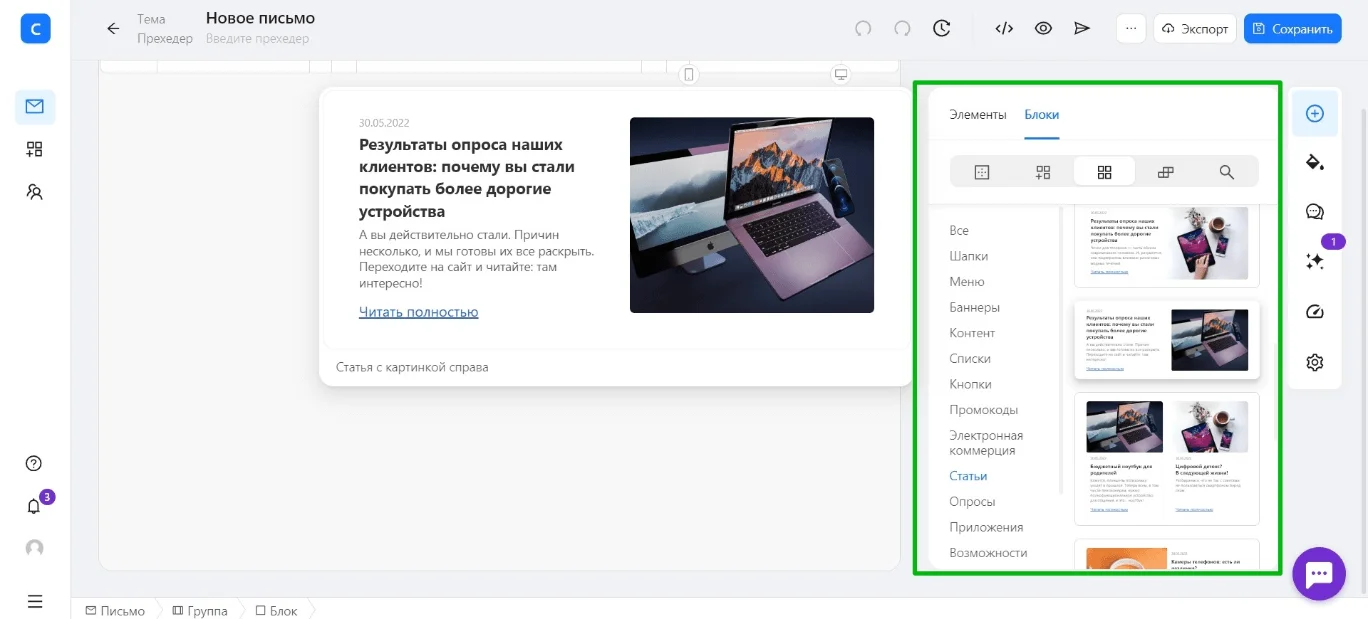 Если дизайнера / верстальщика у вас нет и вы хотите максимально упростить процесс, можете попробовать собирать письмо сразу в конструкторе, пользуясь встроенными инструментами и шаблонами. Преимущество в том, что созданное письмо можно будет сохранить и использовать в качестве шаблона дальше, внося в него небольшие изменения.