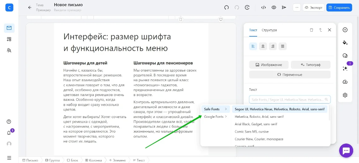 При создании макета письма важно учитывать, как он будет реализован на практике, и использовать те элементы, которые поддерживаются различными сервисами и редакторами. Так. в блочных конструкторах писем, как правило, уже есть наборы шрифтов — и для макета лучше выбирать один из них. Например, в EmailMaker можно выбрать шрифты из числа безопасных, а можно использовать некоторые из Google Fonts.