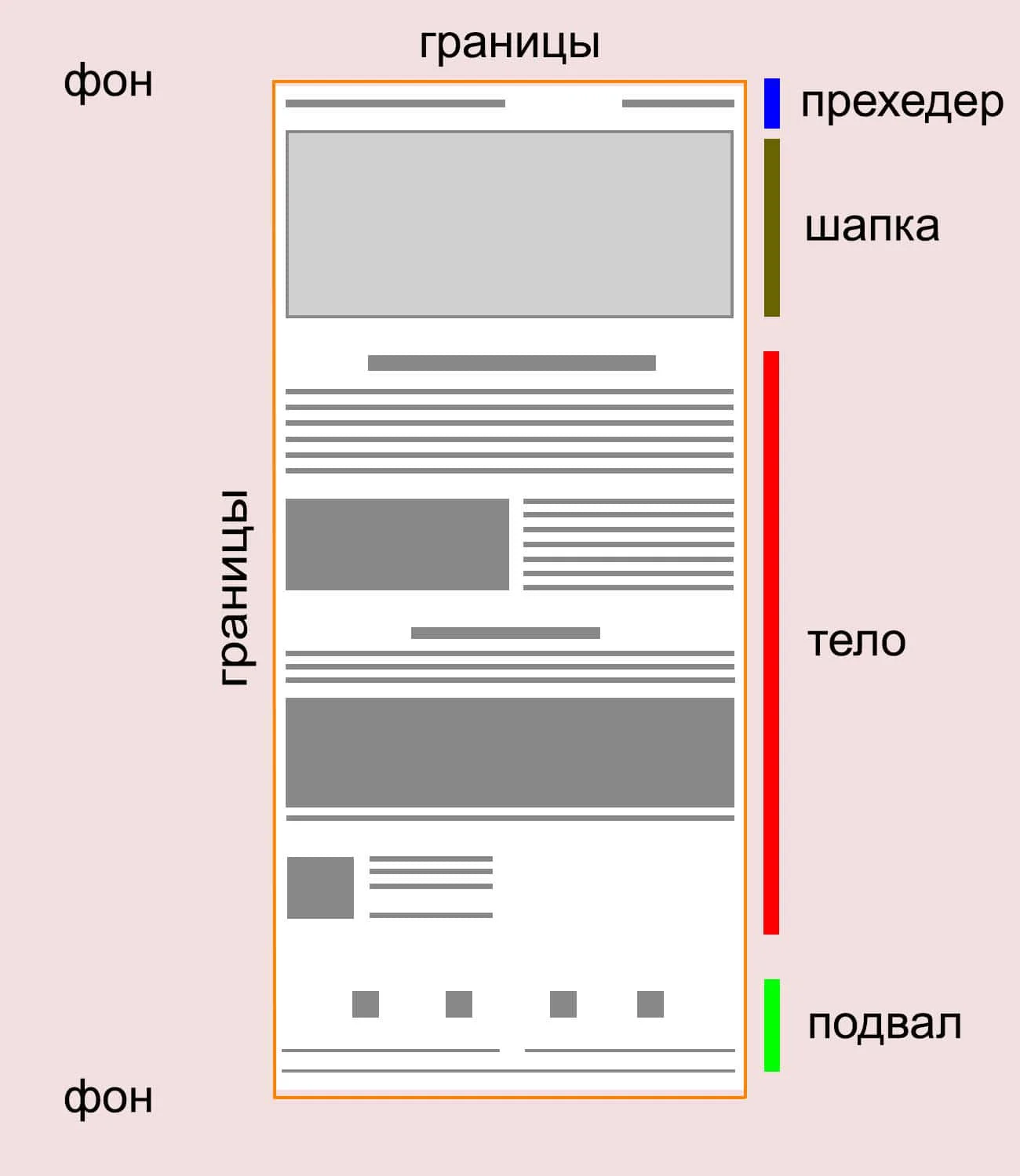 Классическое письмо состоит из прехедера, шапки, тела и футера. Отдельные элементы — границы и фон.