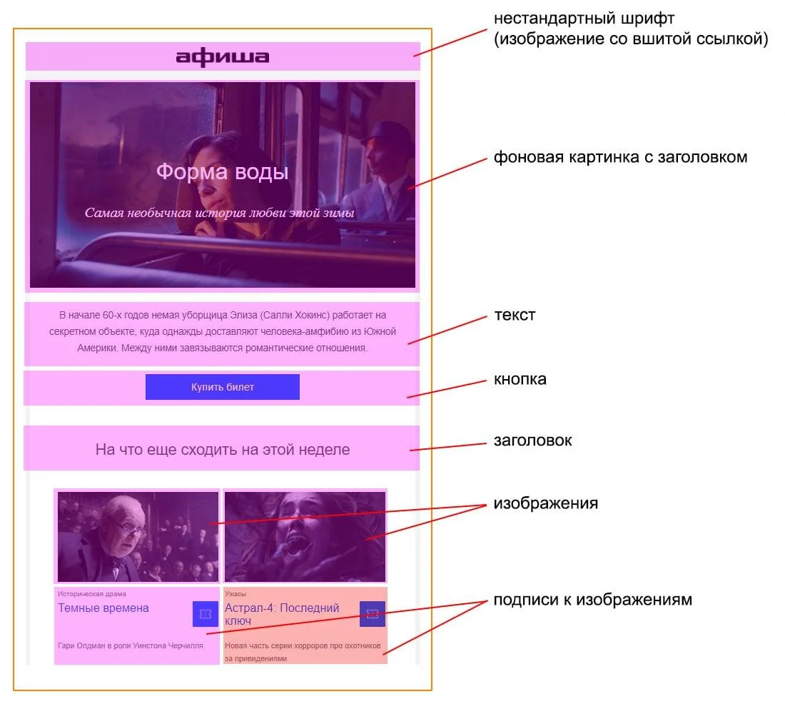 В HTML письма верстают таблицами — о том, почему это важно и какие ещё особенности есть у такой вёрстки писем, можно почитать в статье «Как сверстать письмо: инструкция по HTML и CSS для чайников». Каждый элемент занимает участок в виде прямоугольника или квадрата. Эти модули не пересекаются и редко накладываются друг на друга. Их наполнение может быть разным: текст, изображение, кнопка, GIF-анимация, ссылка.