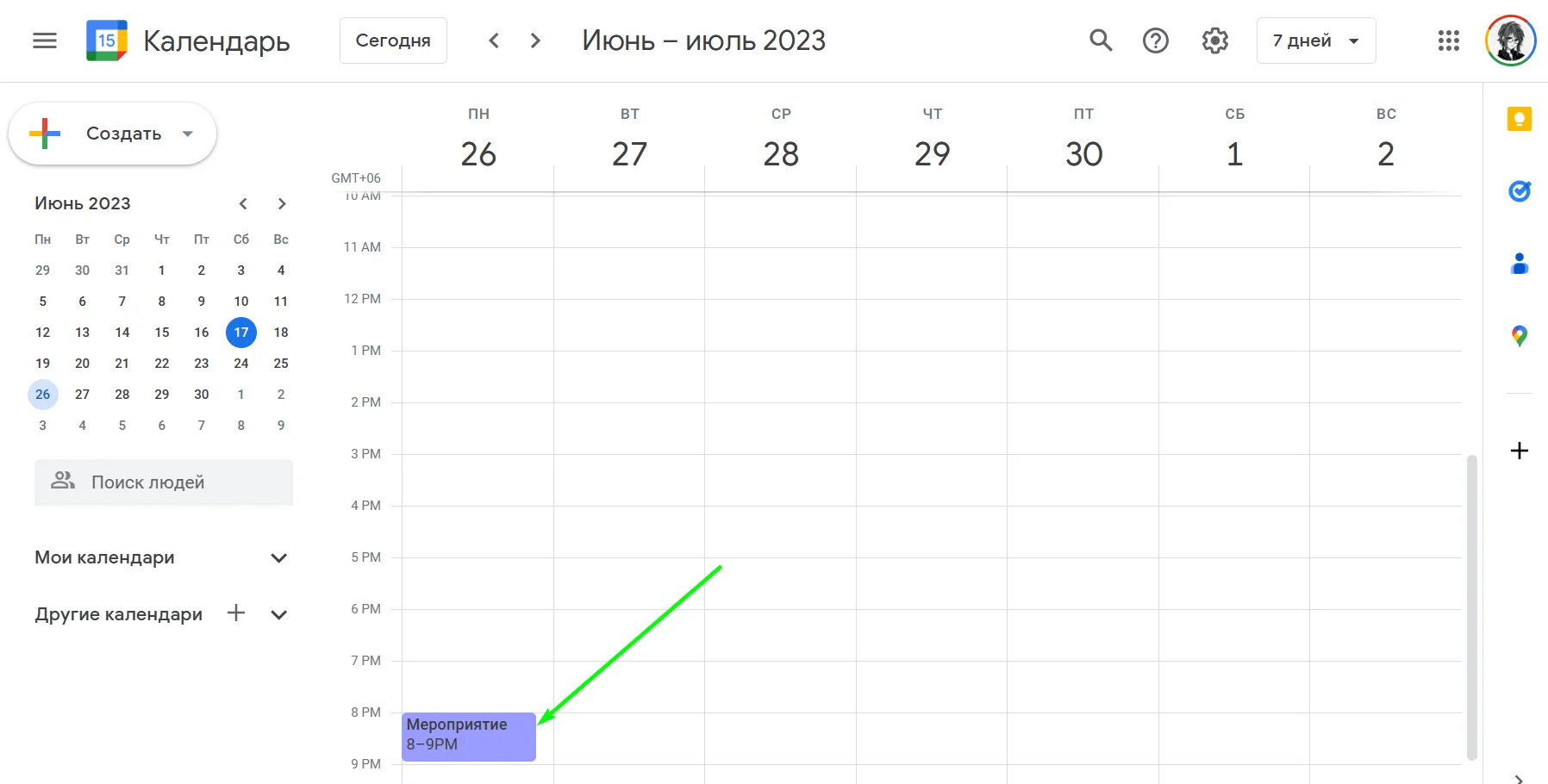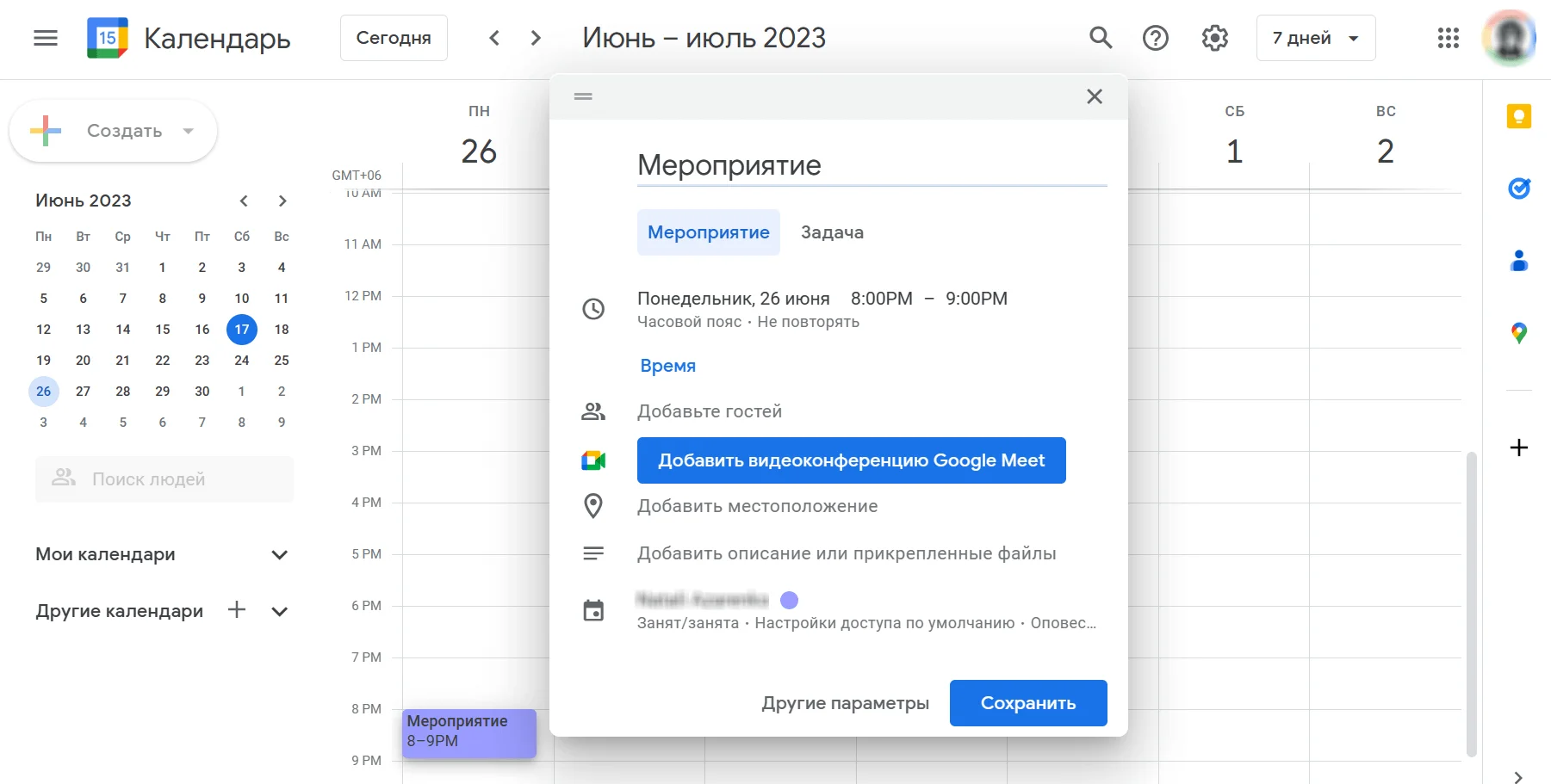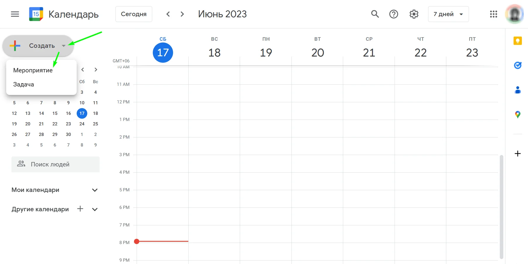 Шаг 2. Кликните на кнопку «Создать» в левой части и выберите «Мероприятие». Также можно нажать на ячейку с соответствующей датой.