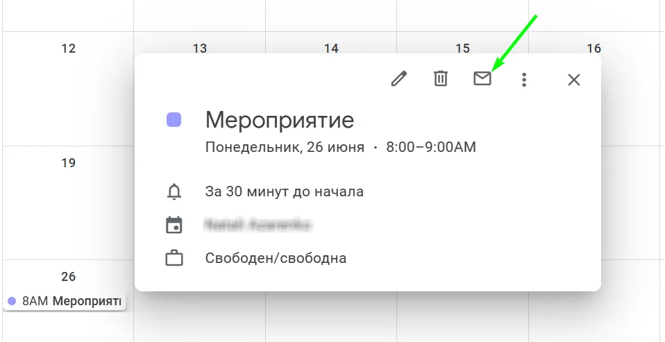 Откройте карточку мероприятия, просто кликнув по ней. Среди иконок в верхней части нажмите на изображение письма.