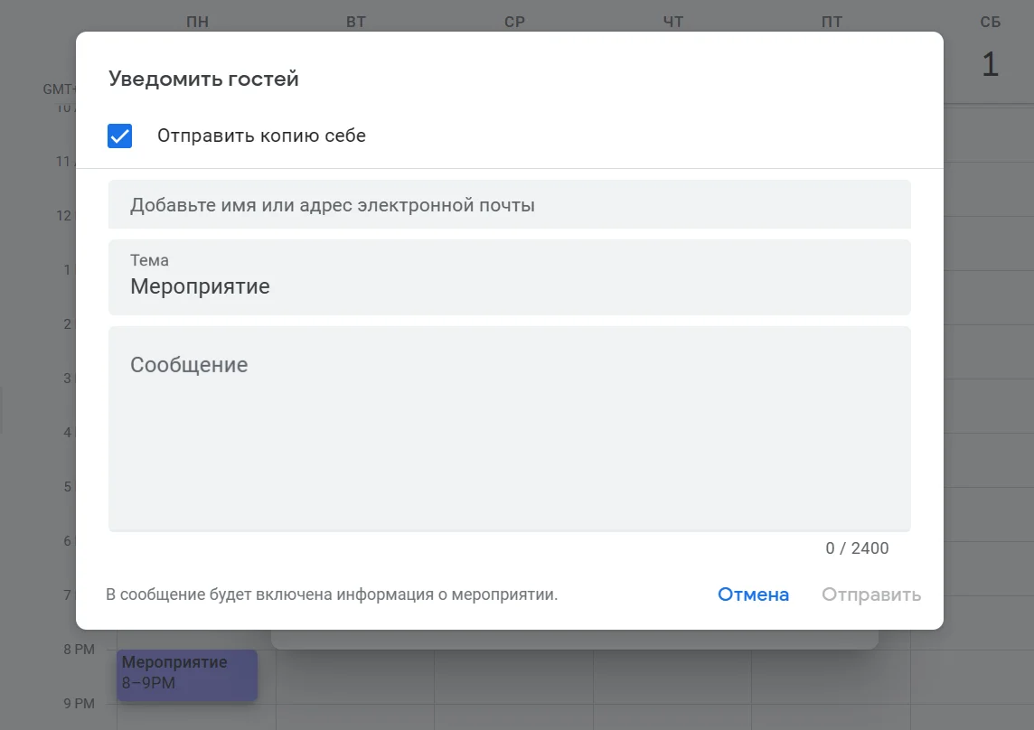 Все пользователи, чьи адреса были указаны в карточке мероприятия, получат приглашения. Но также можно приглашать и других участников. Для этого есть несколько вариантов.
