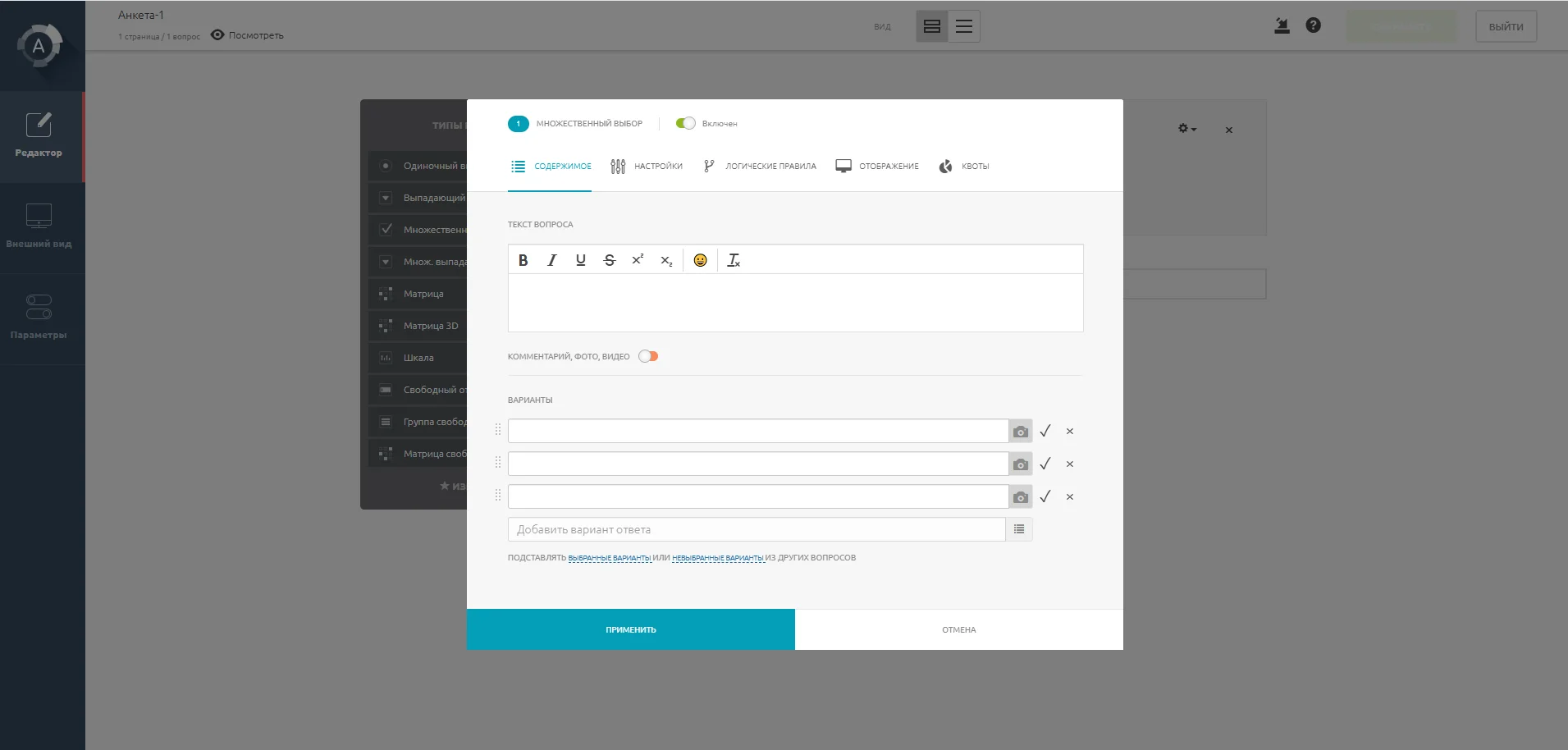 В анкете стандартный набор вопросов — один или несколько вариантов, текстовое поле. Но есть и необычные — матрица и ранжирование.