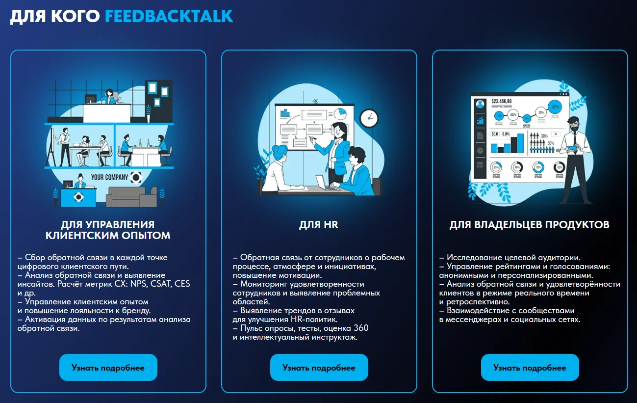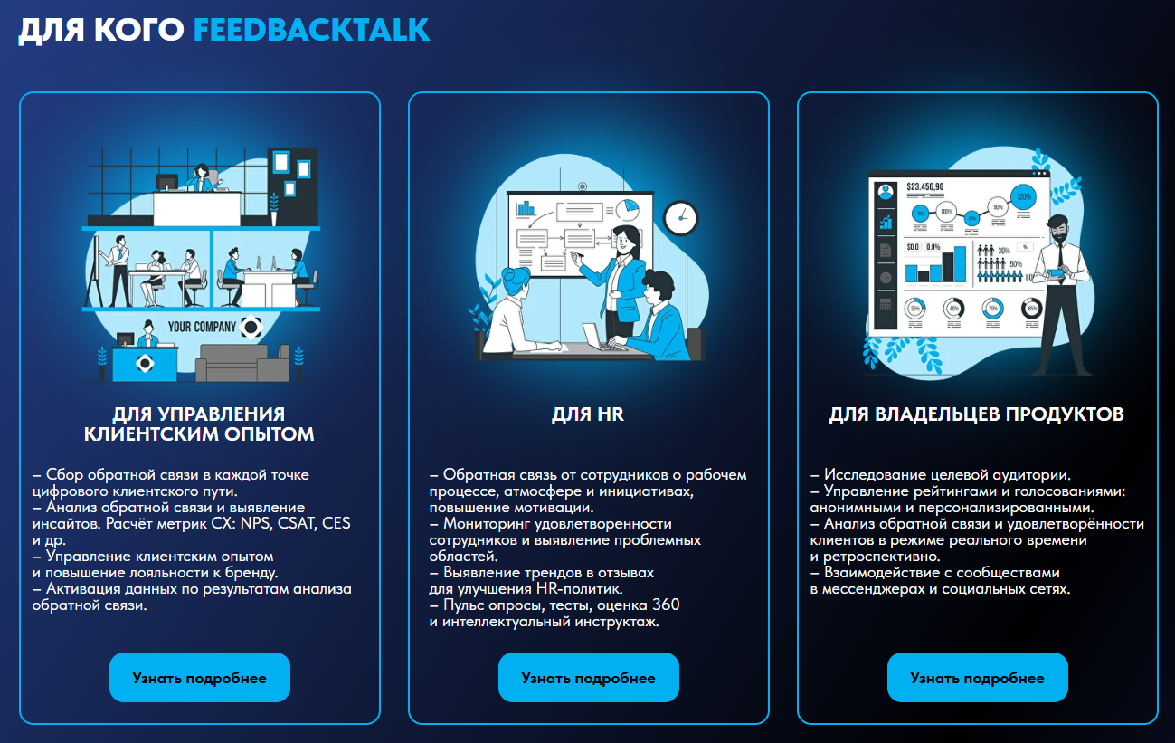 Корпоративная версия подойдёт компаниям федерального масштаба: для повышения эффективности работы продакт-оунеров, маркетологов и сотрудников HR. Облегчённая версия — для управления опросами и обратной связью в малом и среднем бизнесе.